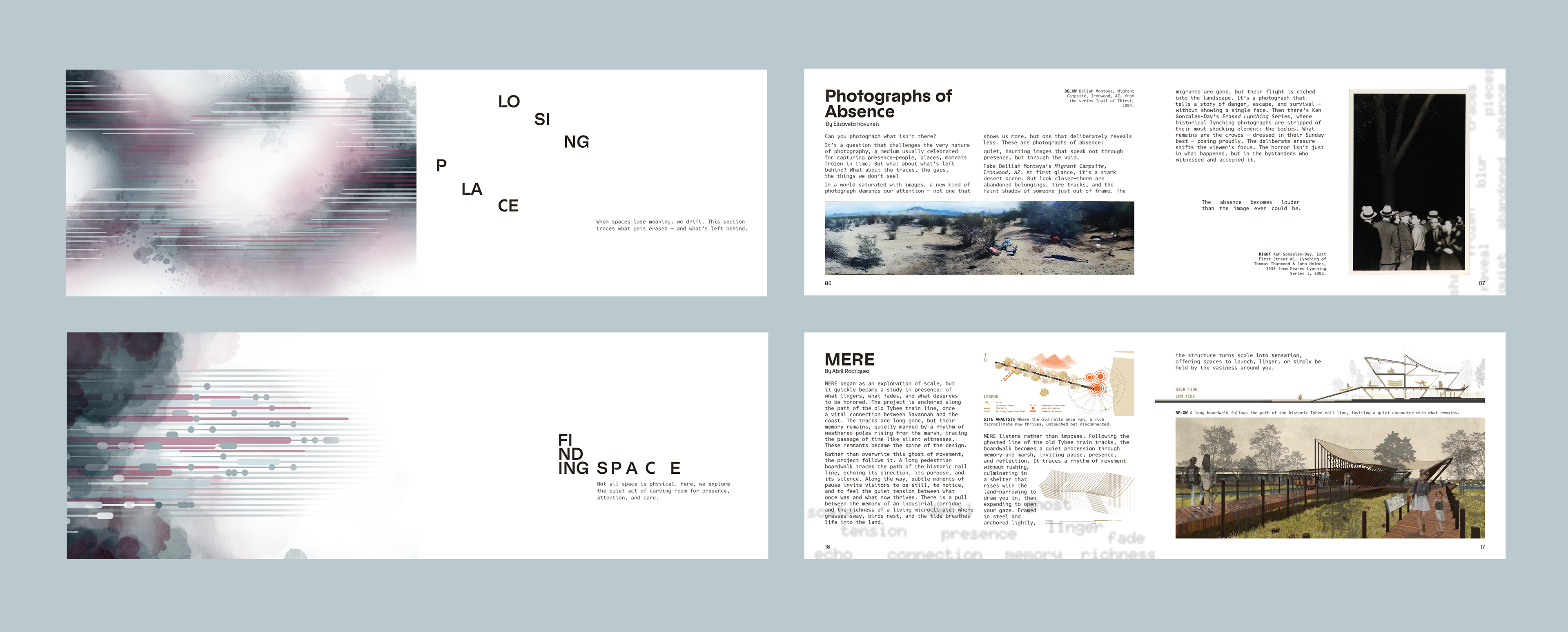 The design of this edition was inspired by the impermanence that even built structures experience in function and space. Each spread was made with the intentionality of trying to record a dream you start to forget as soon as you wake up.